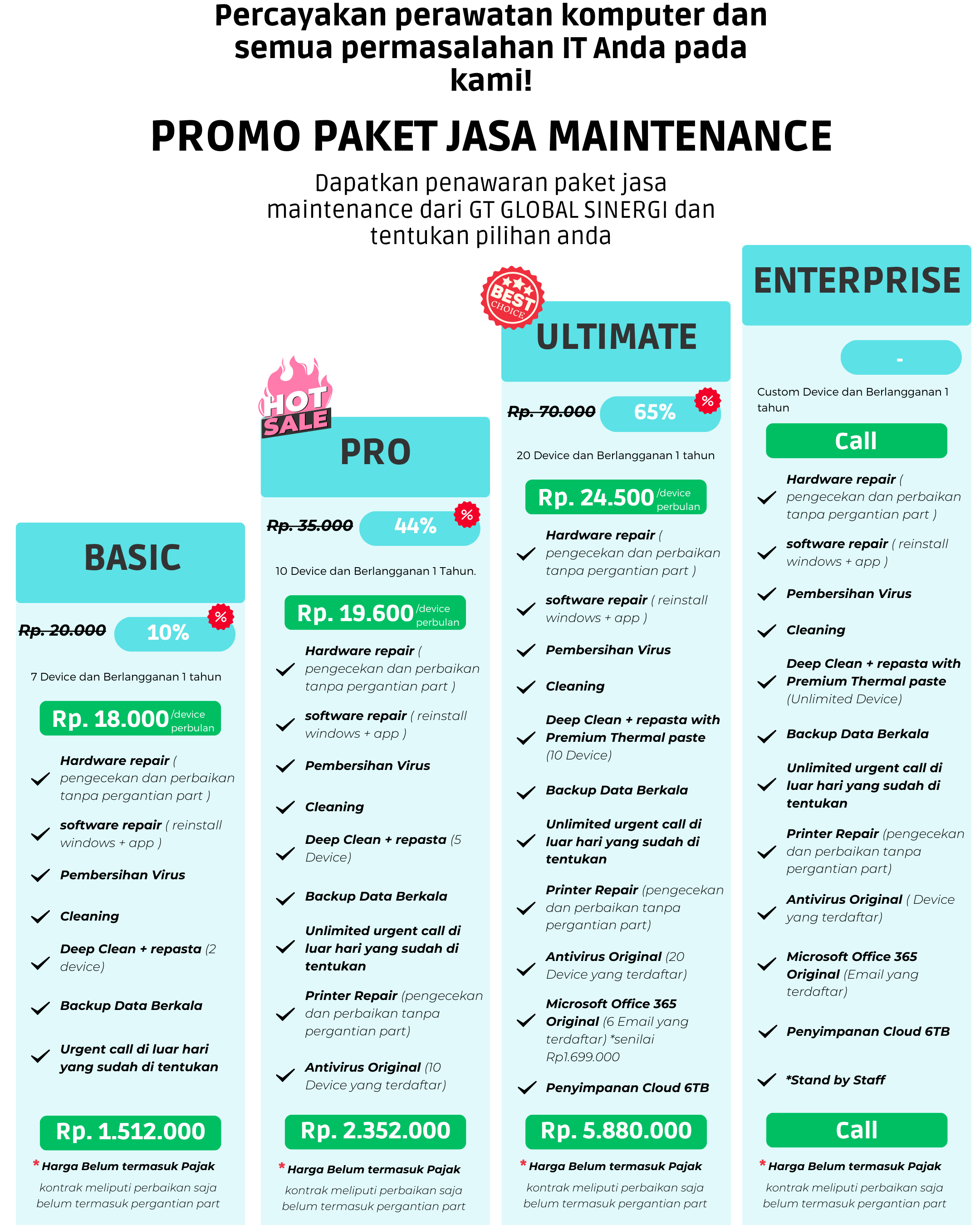CV. GT GLOBAL SINERGI Kami hadir untuk memenuhi semua kebutuhan mesin industrial dan kebutuhan IT mulai dari pengadaan Stabilizer, Stavolt, Genset, UPS, Panel Control, dan Panel Power. Selain itu, kami hadir menjadi solusi dalam kebutuhan IT, mulai dari perakitan PC, Pengadaan Infrastruktur Jaringan, Pengadaan dan Pemasangan Videotron, Pemasangan Video Conference, serta Layanan Perbaikan Laptop dan PC.